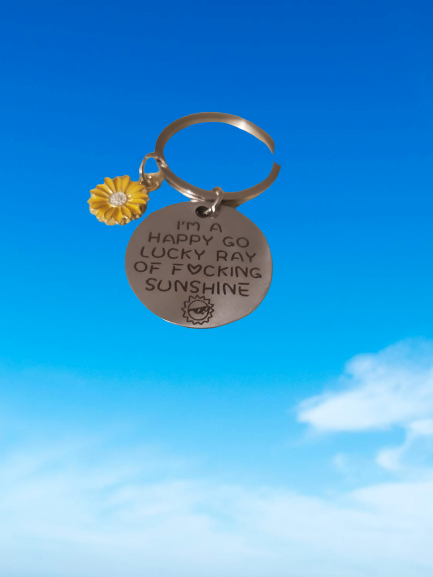 Round Silver "I'M A HAPPY GO LUCK RAY OF FUCKING SUNSHINE" Tag with Flower Charm. Can be added on to select keychains.